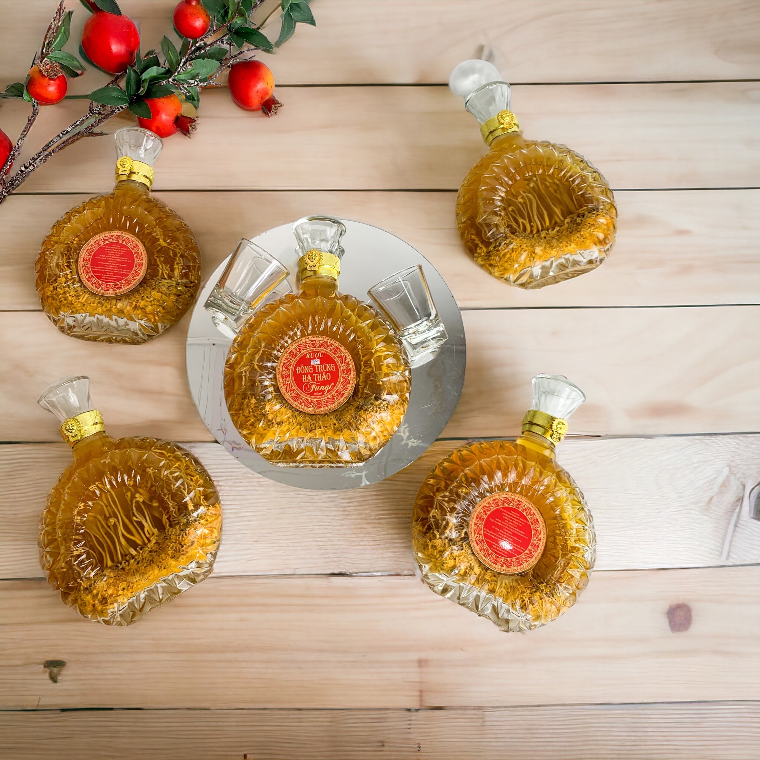 Thành phần: Rượu Nếp qua lọc ngâm cùng Nấm Đông Trùng Hạ Thảo Fungi