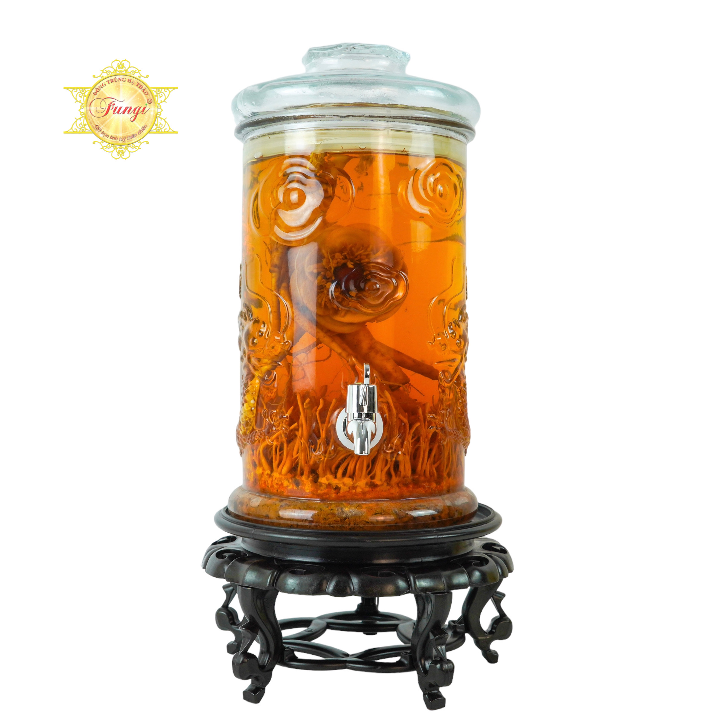 Bên cạnh Nấm Đông Trùng Hạ Thảo tươi, Dược Thảo Fungi còn cho ra mắt sản phẩm rượu Nấm Đông Trùng Hạ Thảo Fungi bình 5 lít đặc biệt với 1 củ nhân sâm và một hoa sâm thiết kế tinh tế.